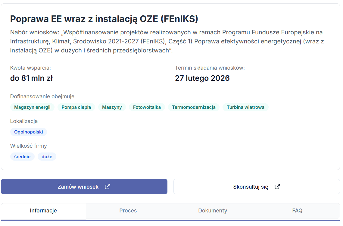 Nabór wniosków w zakresie programu priorytetowego: „Współfinansowanie projektów realizowanych w ramach Programu Fundusze Europejskie na Infrastrukturę, Klimat, Środowisko 2021-2027 (FEnIKS), Część 1) Poprawa efektywności energetycznej (wraz z instalacją OZE) w dużych i średnich przedsiębiorstwach”.